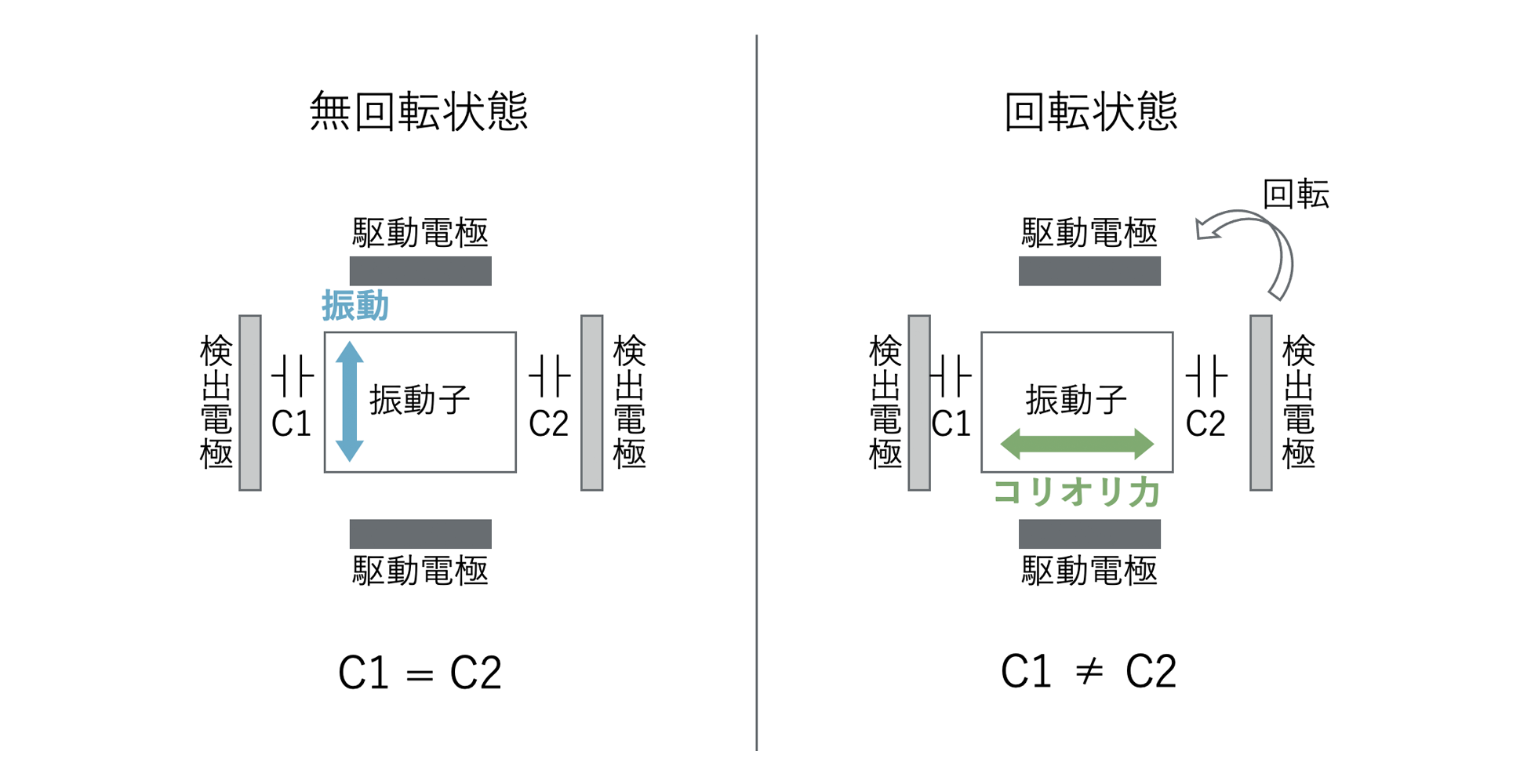 無回転状態で、駆動電極に矩形波の電圧を加えて振動子を一定周期で振動させた時、検出電極と振動子の間の静電容量C1=C2とします。そこに回転が加わると、コリオリ力が発生し、振動子がずれます。この時、検出電極と振動子の距離が変化し、静電容量C1≠C2となります。この静電容量差を測定することで、角速度を算出します。