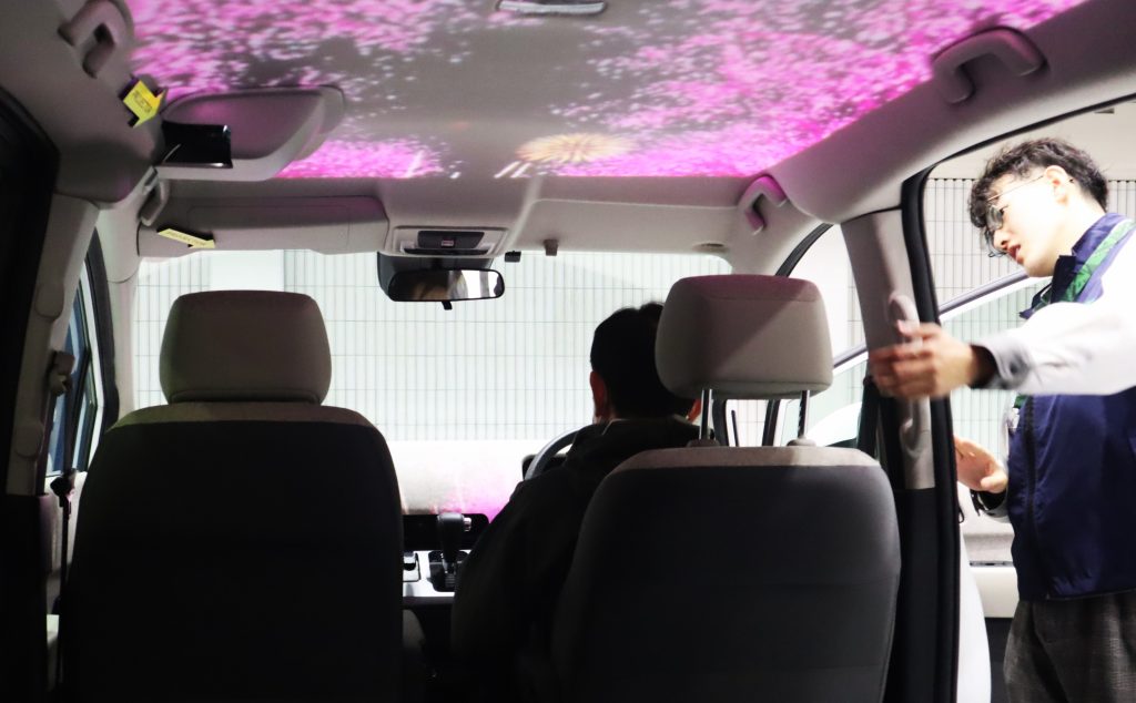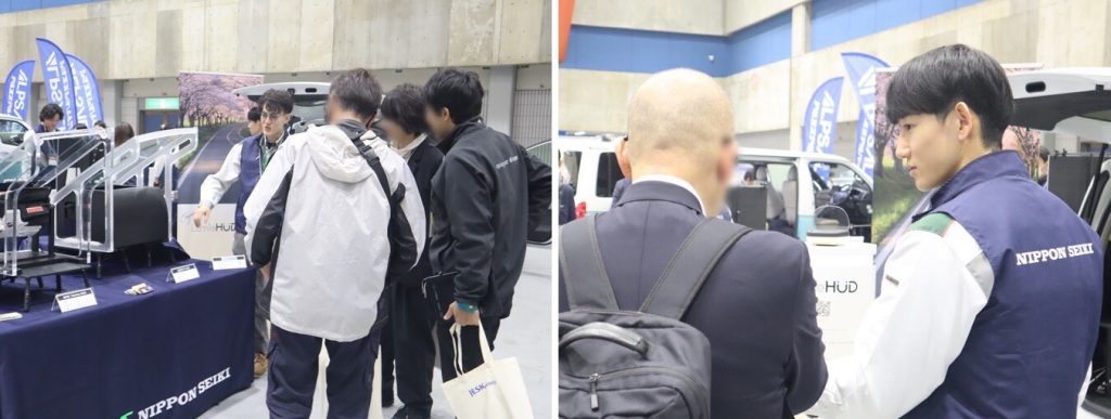 訪れた方々は、デモカーに乗って車載プロジェクターの投映の鮮やかさに驚いたり、ヘッドアップディスプレイをのぞき込んで遠くに表示が見える様子を楽しんだりしていました。