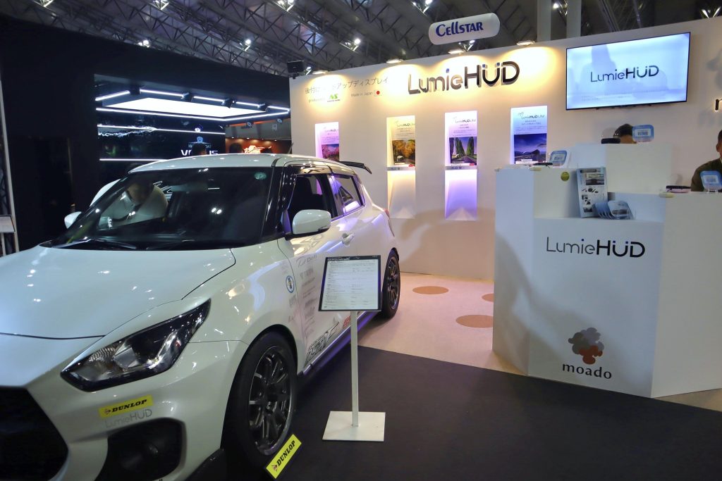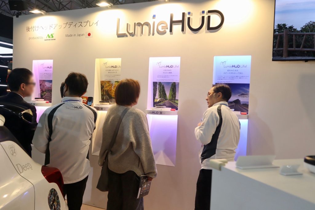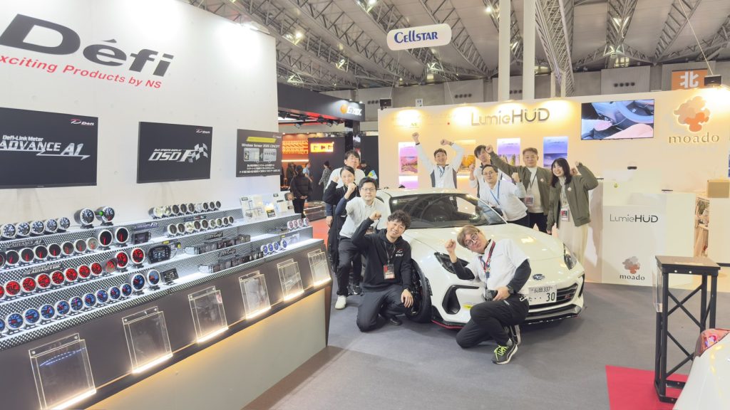 当社のブースでは、車載用品ブランドDefi(デフィ)の紹介と、ライフスタイルブランドmoado(もあど)の後付けヘッドアップディスプレイ『LumieHUD(ルミエハッド)』の展示を行いました。