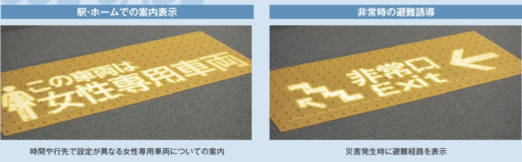 当社が主力事業の車載機器事業で培った光学設計技術と製造技術を活かした、防水・防塵・耐久性を備えた高品質なプロジェクターです。今回の展示では駅構内での使用を想定し、駅ホームを再現したスペースに案内表示を投映します。