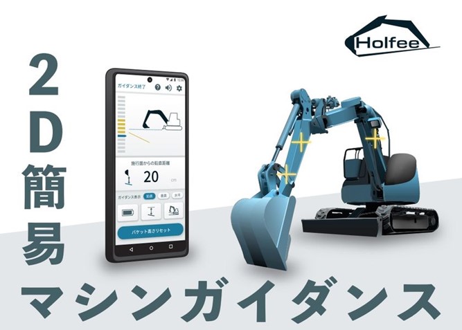 Holfeeは、建設機械(ミニショベル)の操作をサポートする後付けタイプのガイダンスシステムです。専用のスマートフォンアプリと連動させることで、オペレーターに現在の地面掘削深度や、目標とする掘削の深さ・勾配に関する情報などを表示します。